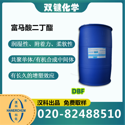 富马酸二正丁酯(HANERCHEM®DBF)不但是一种能力很强的溶剂,也是非常重要的化学 合成材料:共聚单体和有机合成中间体。它的分子量为 228.28,属不饱和的二元酸酯,其反 应性质活泼,在双键上容易进行加成反应,如与丁二烯,环戊二烯等进行 Diels-Alder 反应, 与氢、腈、硫醇、胺、卤素等进一步的化合物加成,与其它的氨、胺类加成并氨解进行酰胺 化反应等。